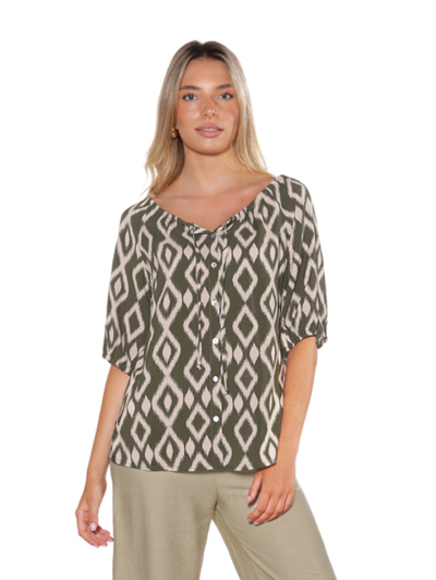Blusón estampado en tonos verdes con motivo geométrico que aporta carácter y un aire natural al look. Presenta escote redondeado con abertura y tapeta frontal abotonada que estiliza sutilmente la silueta. Sus mangas amplias y su corte relajado ofrecen comodidad y una caída fluida muy favorecedora. Una prenda versátil y con personalidad, ideal para combinar con pantalones lisos y conseguir un conju