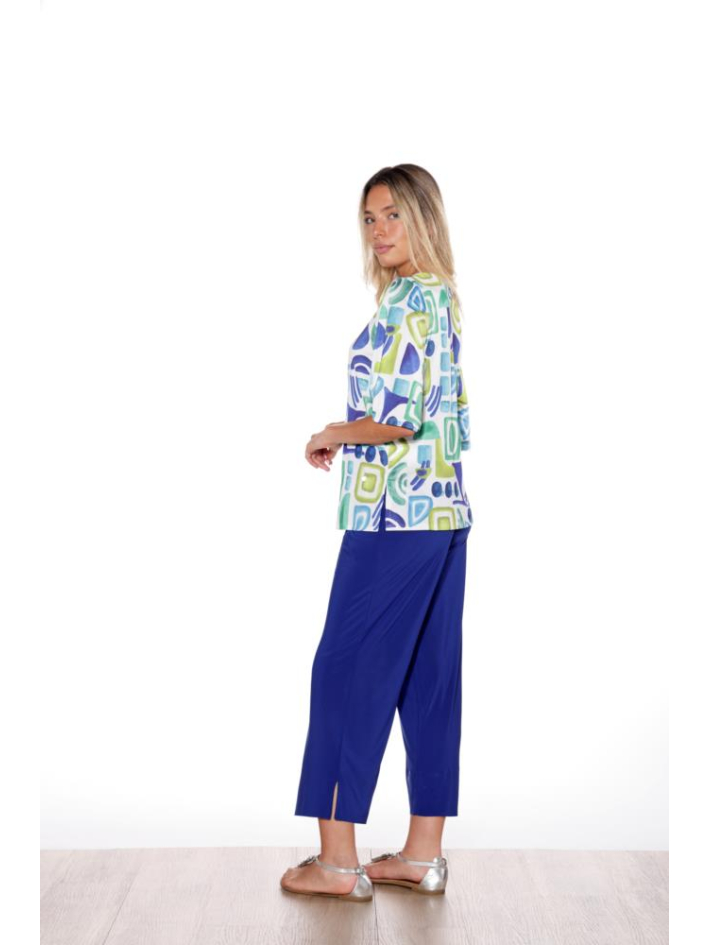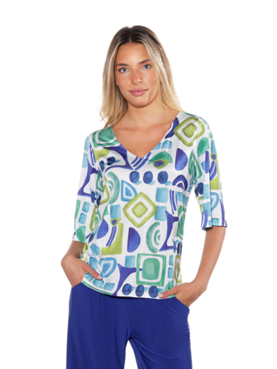 Camiseta de corte recto con caída fluida que aporta ligereza y comodidad al llevarla. Presenta escote en pico y manga francesa, y destaca por su estampado de formas orgánicas que añade carácter al diseño. Confeccionada en tejido suave y flexible, es una prenda versátil que se adapta con facilidad a conjuntos informales o más cuidados.