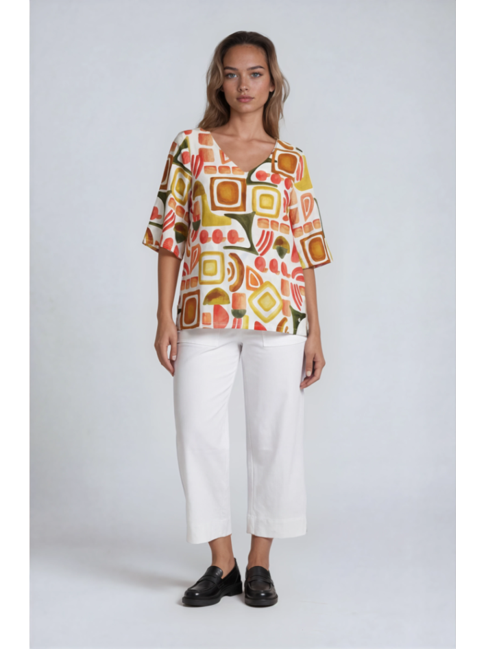 Camiseta de corte recto con caída fluida que aporta ligereza y comodidad al llevarla. Presenta escote en pico y manga francesa, y destaca por su estampado de formas orgánicas que añade carácter al diseño. Confeccionada en tejido suave y flexible, es una prenda versátil que se adapta con facilidad a conjuntos informales o más cuidados.