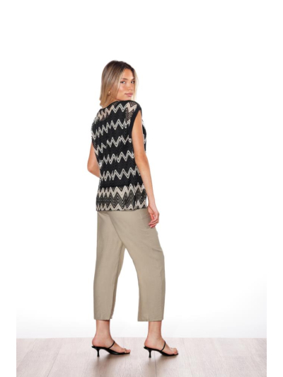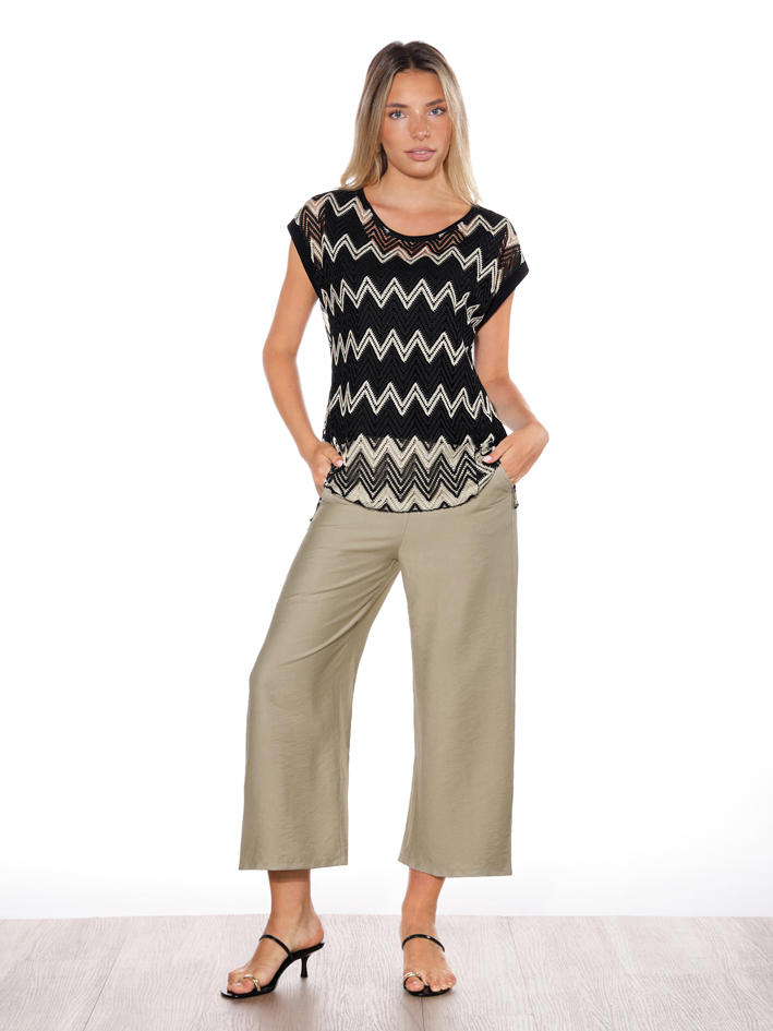 Camiseta de manga corta con diseño calado en motivo zigzag que aporta textura y un estilo muy actual. Presenta escote redondeado y acabado suave en las mangas, con un corte recto que se adapta cómodamente a la silueta.