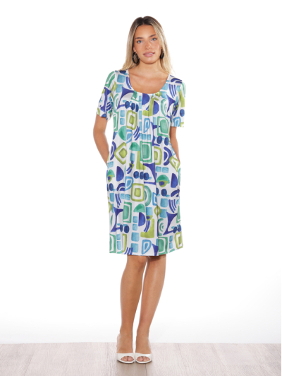 Vestido de corte recto con caída ligera que aporta soltura y comodidad en el movimiento. Presenta escote redondo, manga corta y prácticos bolsillos laterales que suman funcionalidad sin restar ligereza al diseño. Confeccionado en tejido suave y fluido, destaca por su estampado de formas orgánicas que añade dinamismo, ideal para looks diarios con un toque actual.