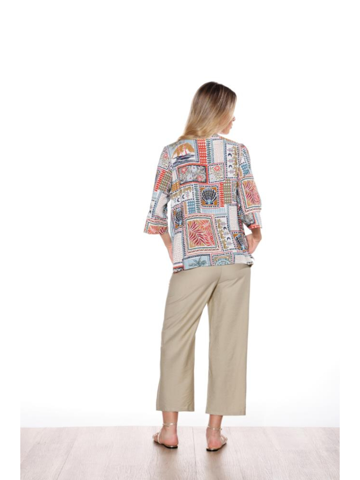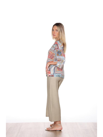 Blusón cerrado de corte fluido con escote en pico que estiliza la parte superior y aporta un aire femenino y delicado. Combina cuerpo liso con mangas semitransparentes de tejido calado, ligeramente abullonadas y ajustadas en el puño para crear un efecto suave y elegante.El bajo incorpora una franja calada a juego con las mangas, aportando continuidad al...