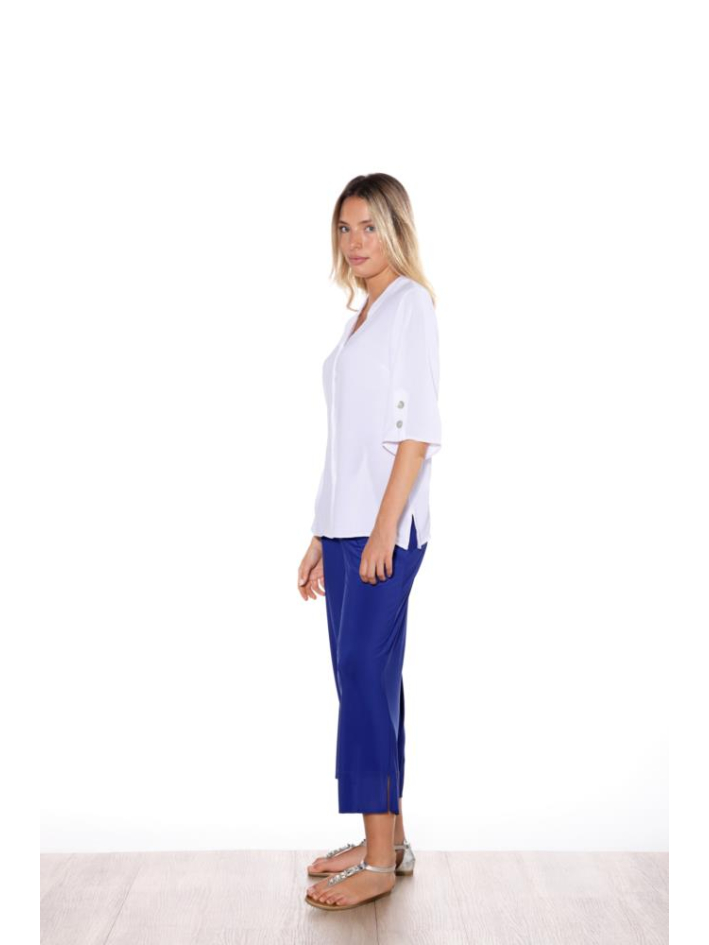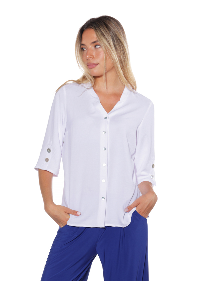 Blusón de manga francesa en tejido fluido y ligero que aporta elegancia y comodidad a partes iguales. Presenta escote en pico con cierre frontal abotonado que estiliza la silueta y permite llevarlo abierto o cerrado según el look. Las mangas incorporan detalle de botones decorativos que añaden un toque actual y diferenciador. Su corte recto y caída suave lo convierten en una prenda versátil, perfe