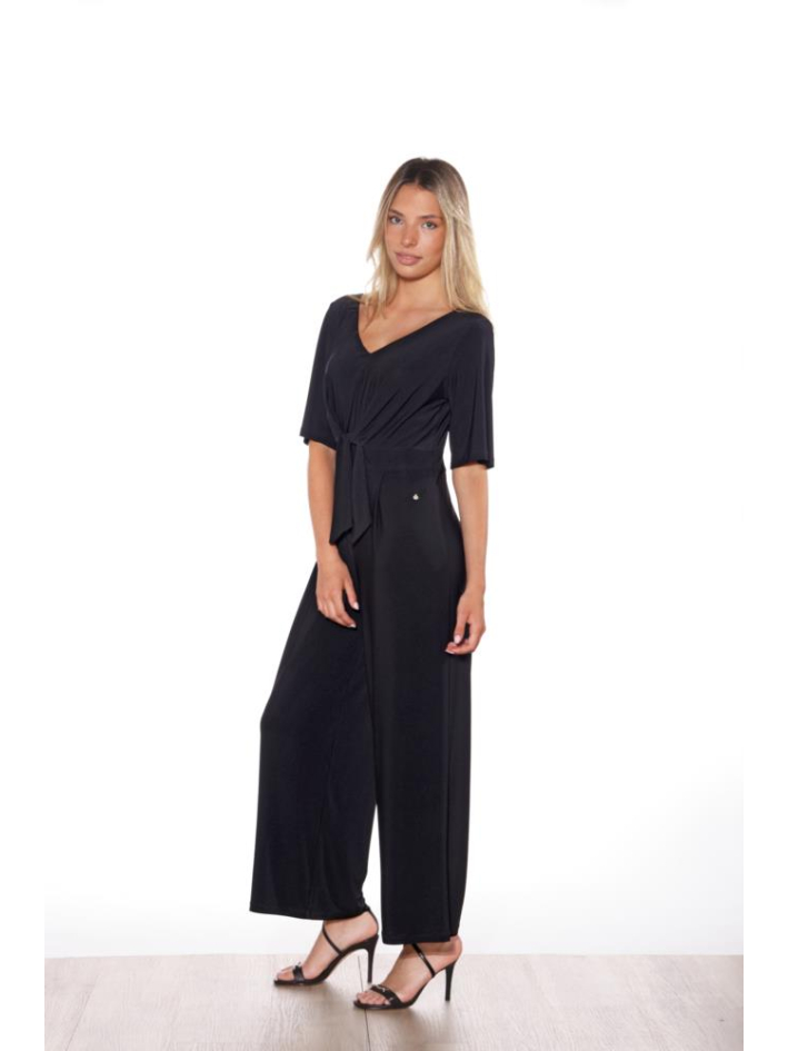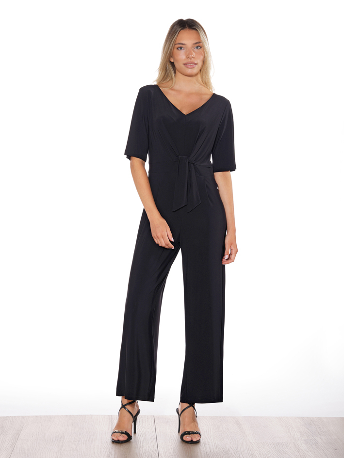 Mono largo en tejido fluido que aporta elegancia y movimiento en cada paso. Presenta escote en pico que estiliza la parte superior y manga amplia al codo que equilibra la silueta con un aire sofisticado. La cintura se define con lazada del mismo tejido, realzando la figura de forma favorecedora. Su pantalón de pierna ancha alarga visualmente y añade comodidad, convirtiéndolo en una opción versátil
