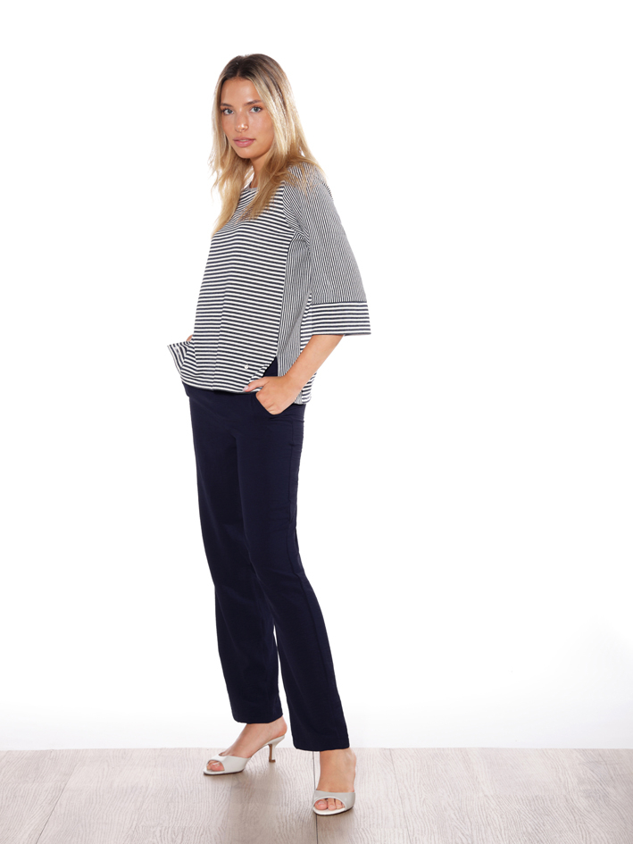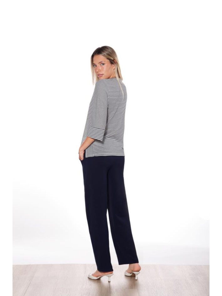 Camiseta de punto con diseño de rayas y silueta amplia que aporta un estilo moderno y relajado. Presenta escote redondo y manga amplia tipo francesa, creando un efecto fluido y muy favorecedor.