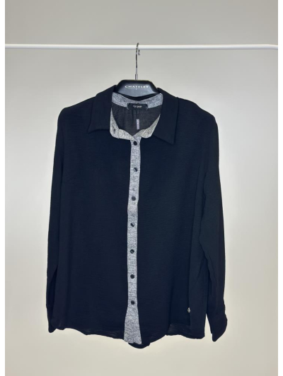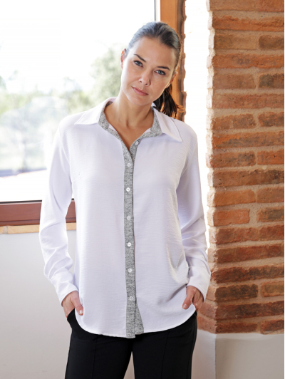 Blusa de manga larga con cuello camisero y tapeta de botones a contraste. Su corte recto y fluido aporta comodidad, mientras que los detalles en el cierre y el cuello realzan la prenda con un toque elegante y distintivo. Ideal para llevar tanto en conjuntos formales como en looks más casuales.