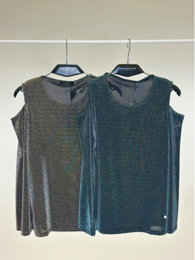 Top sin mangas confeccionado en tejido brillante con un favorecedor escote drapeado. De corte recto y caída ligera, es una prenda elegante y versátil que puede combinarse tanto en looks de día con chaquetas o cárdigans, como en estilismos de noche para aportar un toque sofisticado y luminoso.