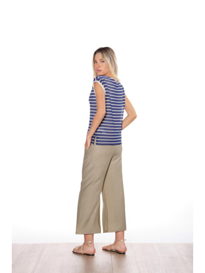 Camiseta de manga corta con diseño calado de rayas que aporta textura y un estilo muy actual. Presenta escote redondeado y hombro ligeramente caído, creando una silueta relajada y favorecedora.