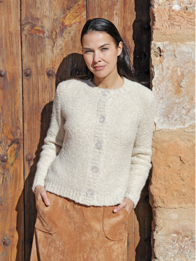 Chaqueta de punto bouclé con un tacto suave y acogedor. Su diseño recto con cierre de botones grandes aporta un aire desenfadado y muy versátil, ideal para dar calidez y estilo a cualquier look.