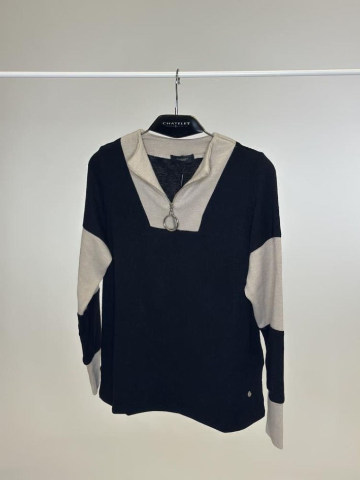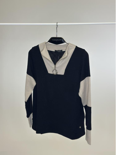 Este jersey destaca por su diseño en punto combinado con detalles en contraste en las mangas y el interior del escote. El cuello en pico con cierre de aro metálico aporta un aire actual y desenfadado, mientras que la mezcla de tonos lo convierte en una prenda versátil y fácil de combinar. Ideal para dar un toque moderno a los looks del día a día.