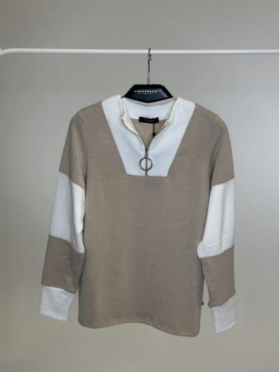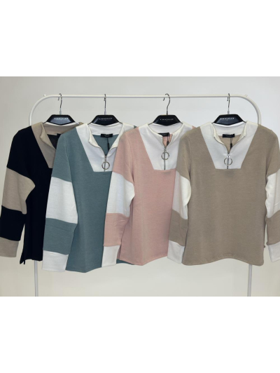 Este jersey destaca por su diseño en punto combinado con detalles en contraste en las mangas y el interior del escote. El cuello en pico con cierre de aro metálico aporta un aire actual y desenfadado, mientras que la mezcla de tonos lo convierte en una prenda versátil y fácil de combinar. Ideal para dar un toque moderno a los looks del día a día.