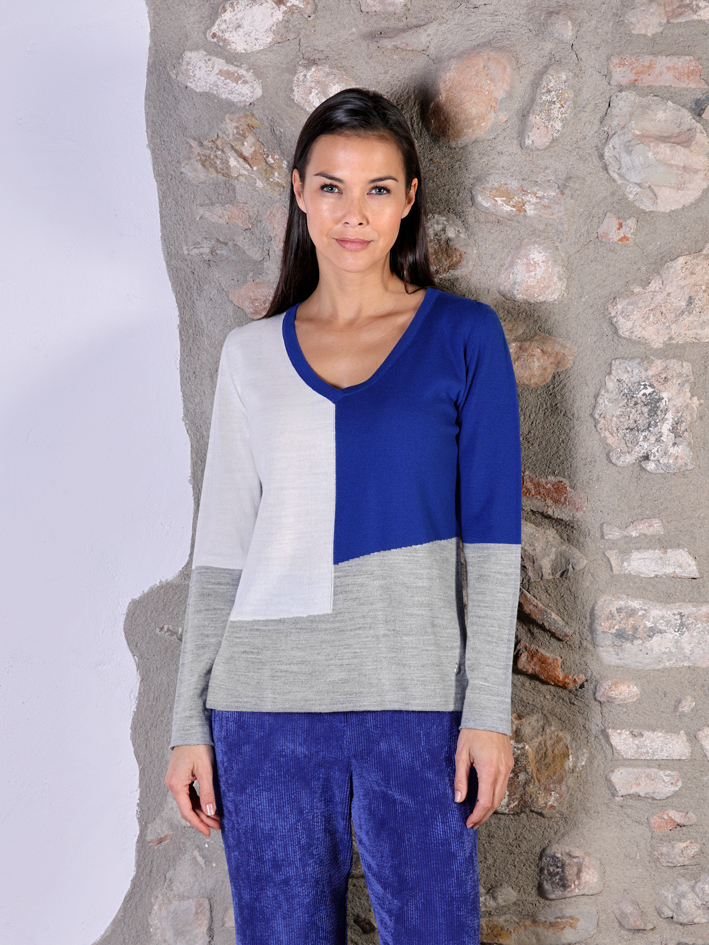 Jersey de punto fino con un diseño actual y favorecedor. Su cuello en pico estiliza la figura, mientras que el juego de bloques geométricos aporta un toque moderno y sofisticado. Una prenda ligera, cómoda y fácil de combinar, ideal para darle a tu look diario un aire elegante sin renunciar a la comodidad.